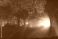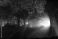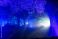 • Seville, Spain public gardens at night show blue and violet beams slicing mist, trees lit from below, visitors as silhouettes, and a white source casting starburst rays.
