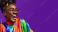 • Lachende Afroamerikanische Frau mit bunter Kleidung und Brille auf leuchtendem violetten Hintergrund, Freude und Positivität
