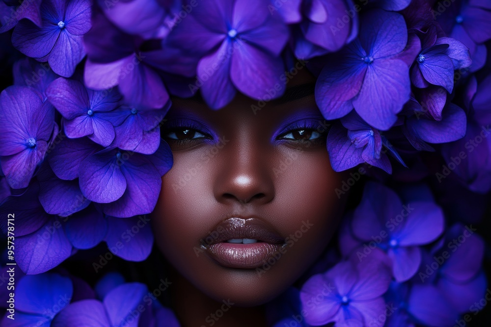 Chabrowy - black woman model with violet hydrangea flowers editorial fashion style, well preserved skin... #957378712