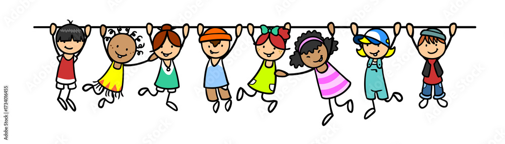 • Gruppe Cartoon Kita Kinder hängt an Linie als Rahmen