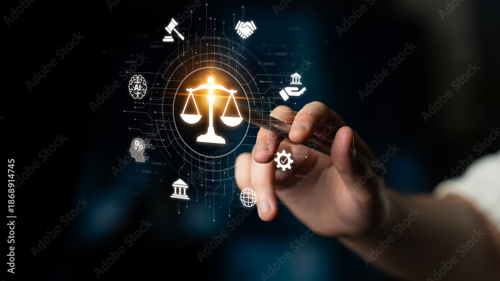 Owoce - Futuristic digital law interface displaying justice scale, highlighting digital law, AI... #1868914745
