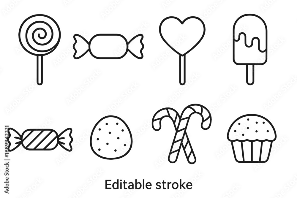 Słodycze - Candy and sweets thin line icon collection. Editable stroke vector illustration set. Minimalist... #1689942221