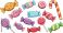 • Colorful assortment of candies including lollipops and wrapped sweets on black background