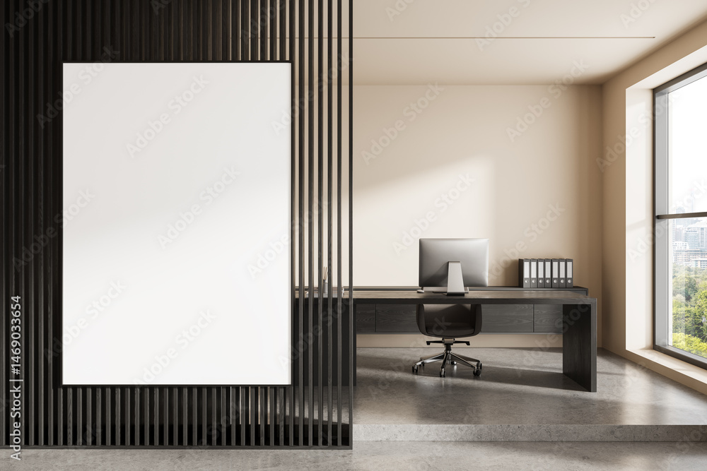 • Modern office interior with computer desk, vertical slats and blank poster on wall, bright window view and minimal workspace concept. 3D Rendering