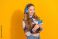 • Young woman with blue headphones smiling at her phone against a bright yellow background in casual style
