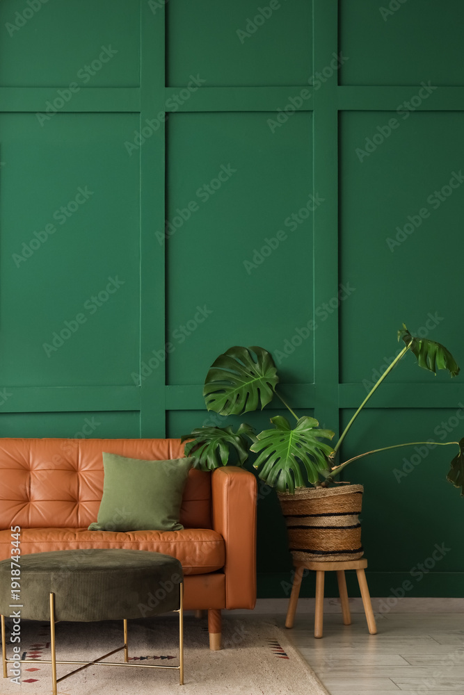 Rośliny - Interior of living room with brown sofa, pouf and palm plant #1918743445
