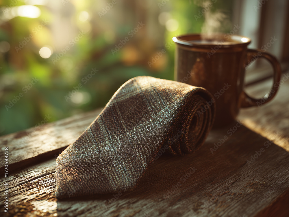 • Skupienie na zrolowanym, wełnianym krawacie w kratę, leżącym na starej, drewnianej powierzchni obok parującego, brązowego kubka. Poranek, ciepłe światło.