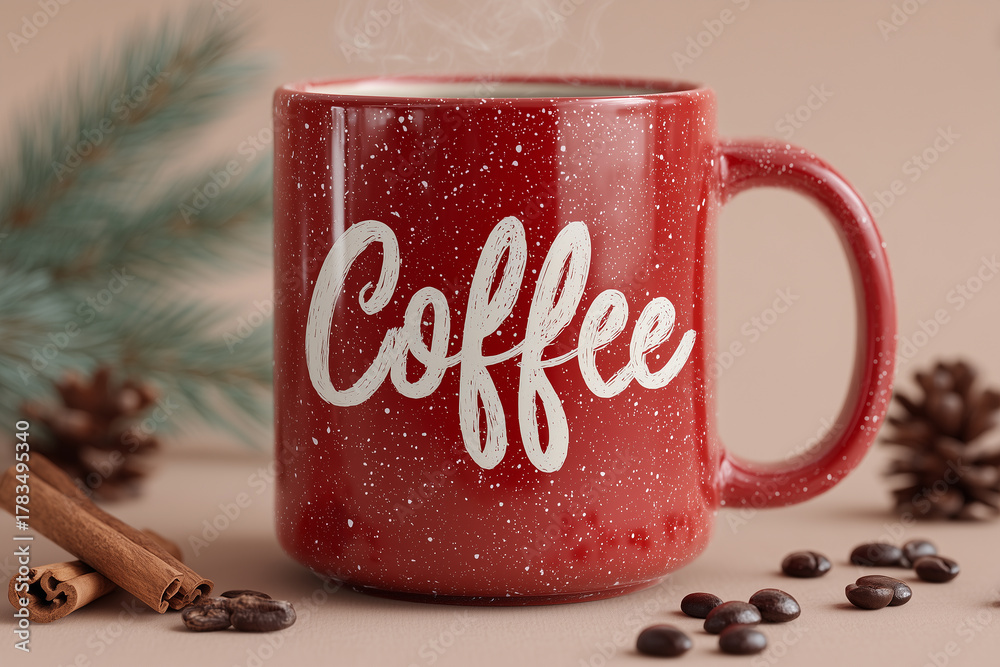 • Czerwony, ceramiczny kubek z napisem "Coffee" na beżowym tle, wypełniony gorącą kawą. Obok szyszki, ziarna, cynamon i igliwie. Widać delikatną parę.