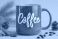 Kawa - Czerwony, ceramiczny kubek z napisem "Coffee" na beżowym tle, wypełniony gorącą kawą. Obok... #1783495340