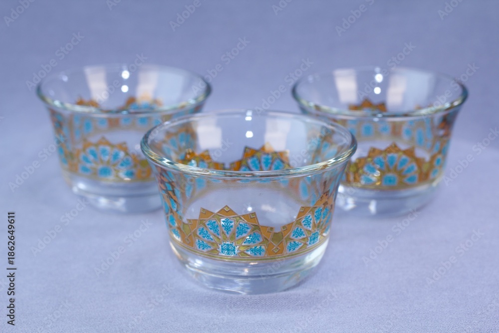 • Set of three clear glass traditional Arabic coffee cups finjan with blue and gold geometric design