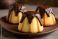 • Mini babki piaskowe z polewą czekoladową na talerzu, domowe słodkie wypieki, deser do kawy w zbliżeniu.