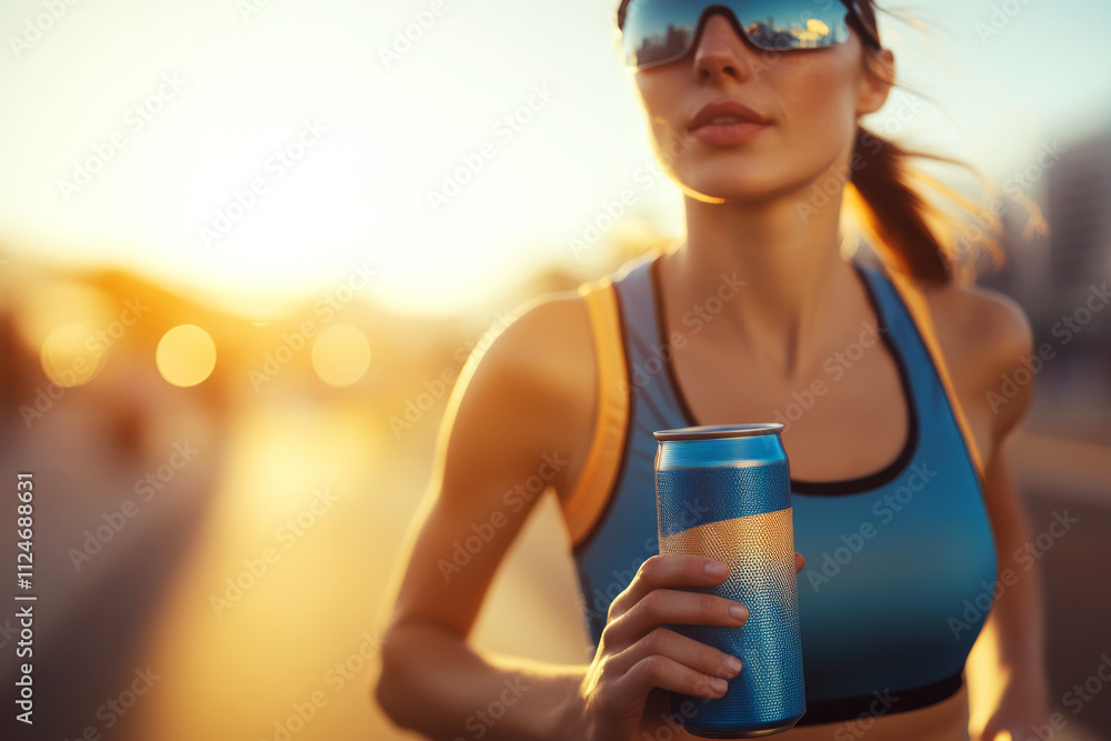 Sport - Woman in athletic gear jogging outdoors, holding a can with blurred background. Concept of... #1124688631