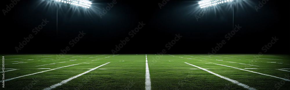 • Football field illuminated by stadium lights, with dark background and ample copy space for advertising or text.