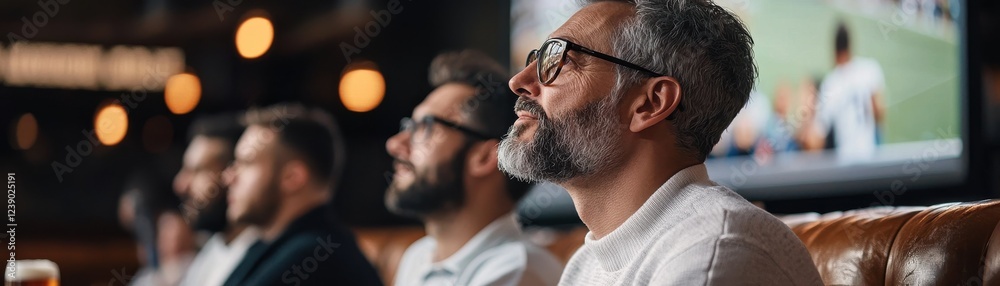 Sport - A group of men intently watching a sports game in a lively bar setting, showcasing a mix of... #1239025191