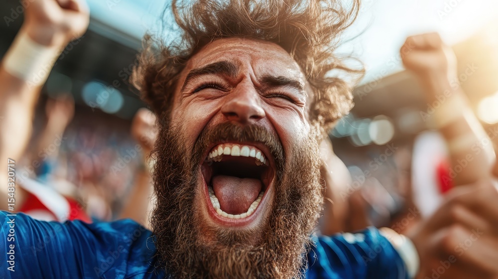 Sport - A passionate fan with wild hair is joyfully celebrating during a sports event, capturing the... #1548320717