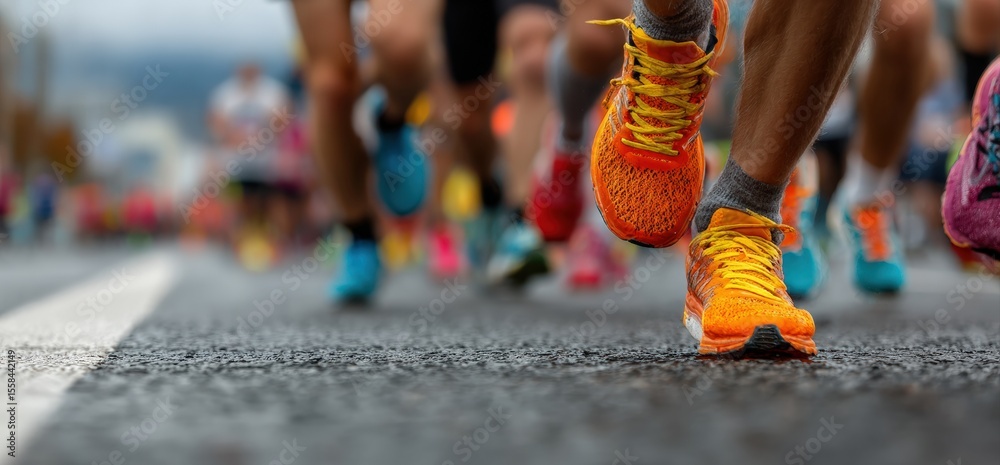 Sport - Athletes running a marathon on a city street, wearing colorful running shoes, competing in a... #1558442149