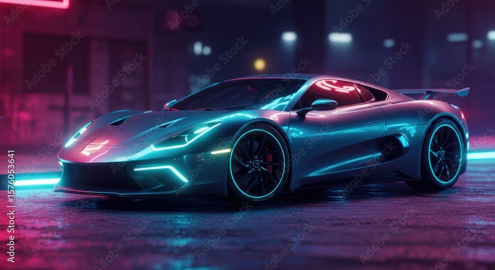• Futuristic neon sports car with sleek design poised on a reflective urban landscape