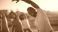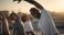 • Group fitness class stretching arms at sunset health and wellness outdoor exercise routine training session
