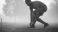 Sport - Man in blue athletic wear tying shoelaces on a foggy field preparing for a run or workout outside... #1607333992