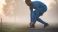 • Man in blue athletic wear tying shoelaces on a foggy field preparing for a run or workout outside on transparent background