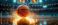 • Basketball bouncing on shiny court floor creating sparks and glowing light with blurred scoreboard and hoop in background