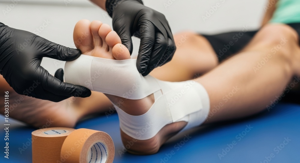 Sport - Close-up of professional ankle wrapping for sports injury recovery #1630351186