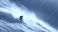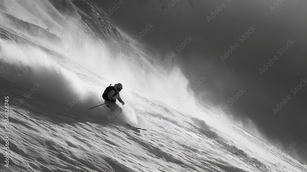 • Skier descending snowy mountain slope extreme sports action dynamic winter black and white photo