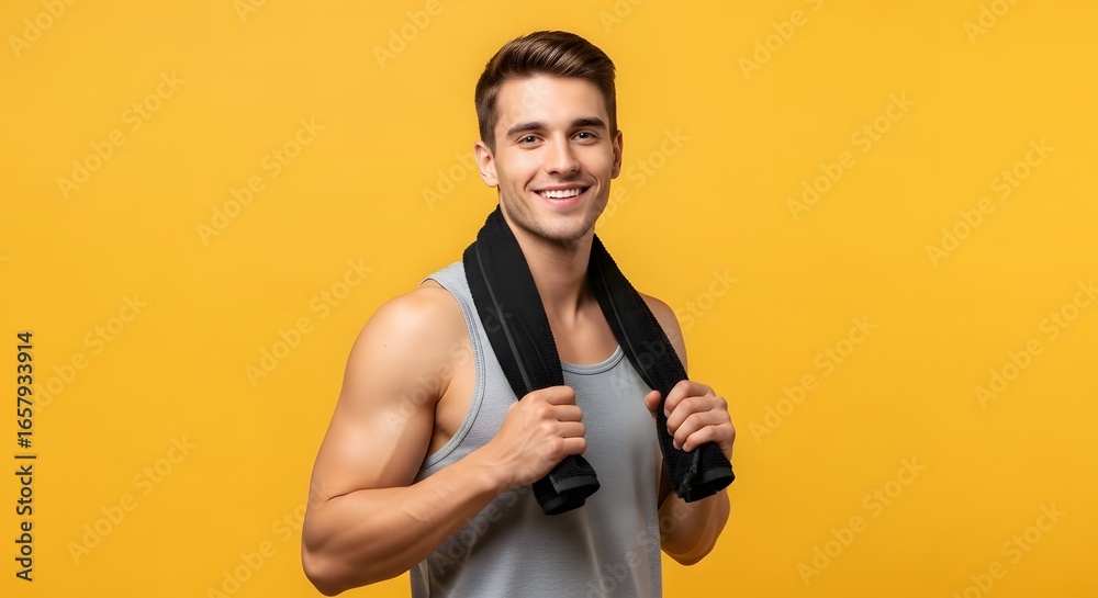 • Handsome sportsman over an isolated yellow background. Cheerful, optimistic, handsome, young sports fitness man standing isolated over a yellow wall background