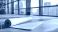 • Unrolled white yoga mat on wooden floor in modern fitness center or at home with big windows and white walls, comfortable space for doing sport exercises, meditating.