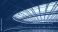 • Large modern sports stadium interior with empty blue seats and transparent arched roof structure