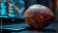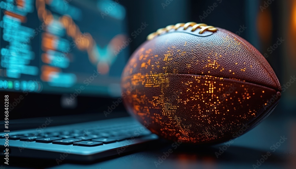 • American football ball rests on laptop keyboard. Screen displays blurred stock market data charts, graphs. Digital technology merges with sports analytics for prediction, betting, fantasy games.