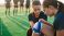 • teen leadership sports concept. Two athletes attend to an injury on the field during practice.