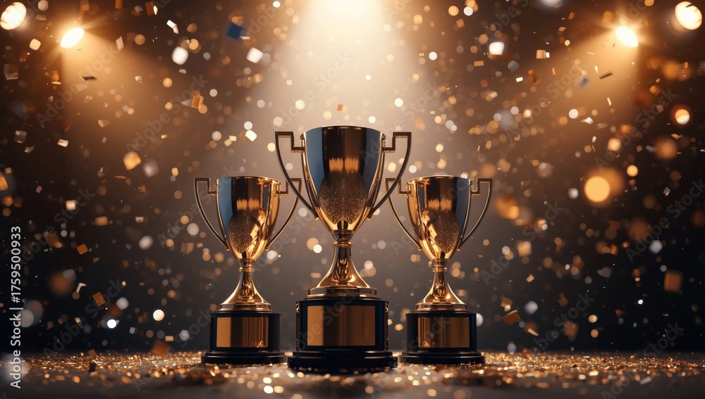 Sport - Three golden trophies stand on a podium under a shower of confetti rain #1759500933