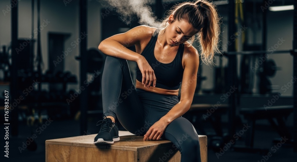 Sport - Exhausted athletic woman with steam rising from her body resting after intense workout. Fit girl... #1767882617
