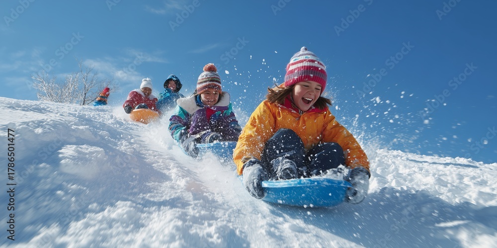 • Cheerful child in winter clothes speeds down a snowy hill on a sled, spraying fresh snow. Pure joy and winter fun.
