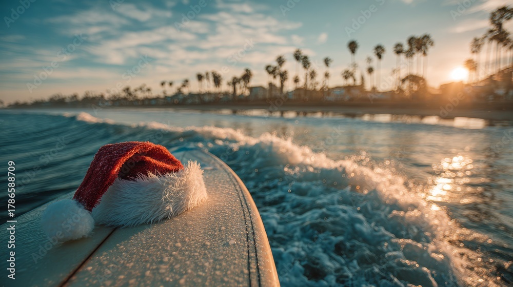 • Santa hat resting on surfboard. Ocean waves and palm trees background