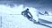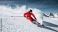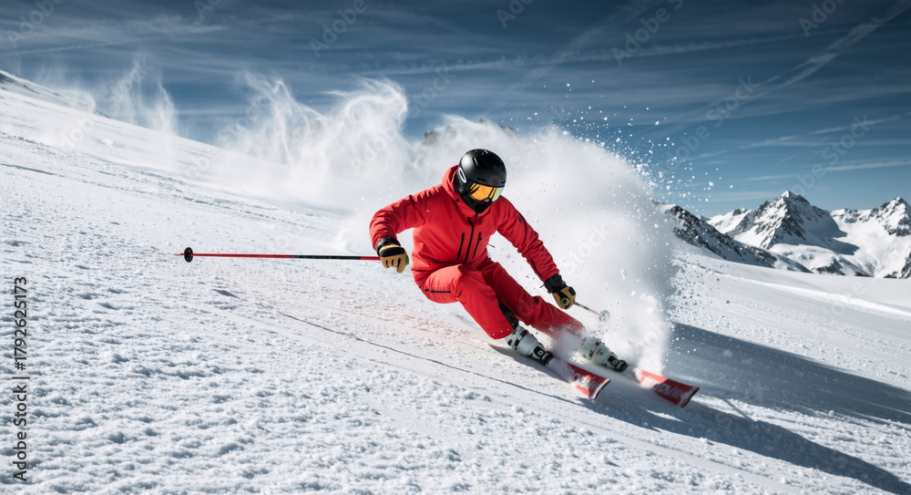 • Skier in a red suit skiing fast down a snowy mountain slope. Dynamic action shot of an athlete carving in fresh powder. Winter sports and alpine adventure concept
