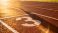 • Close-up of a running track lane marked with number three, bathed in warm sunset light, perfect for sports-themed designs or athletic promotions.