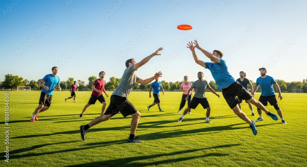 Sport - Group of young males playing ultimate frisbee on a sunny day outdoors #1801104658