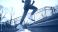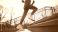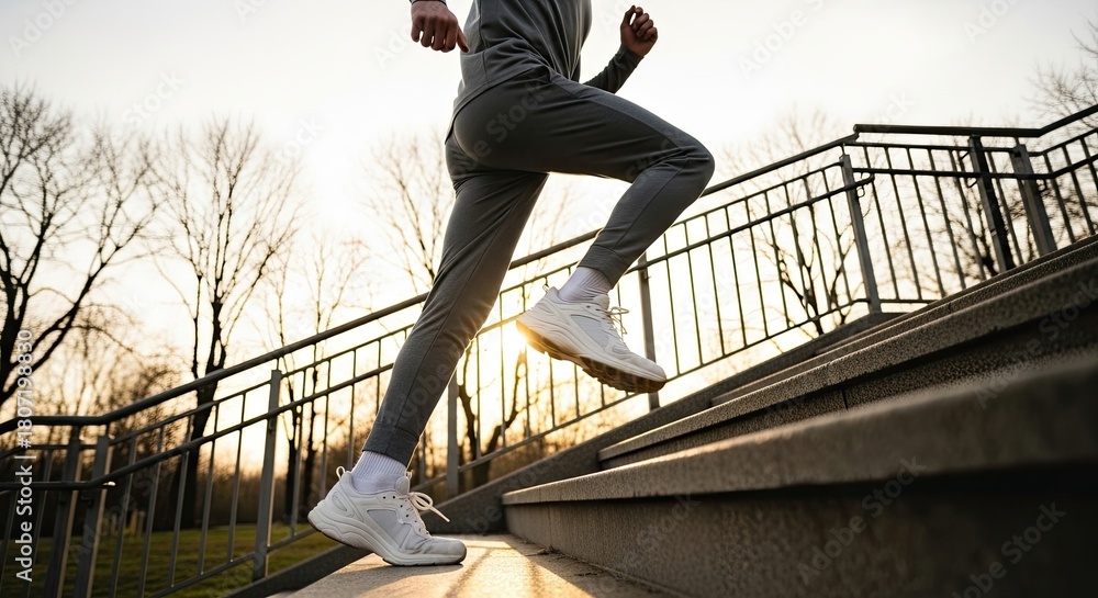 • Low angle view of an athletic person in sportswear running up concrete stairs outdoors during a beautiful sunset workout, embodying a healthy and active lifestyle