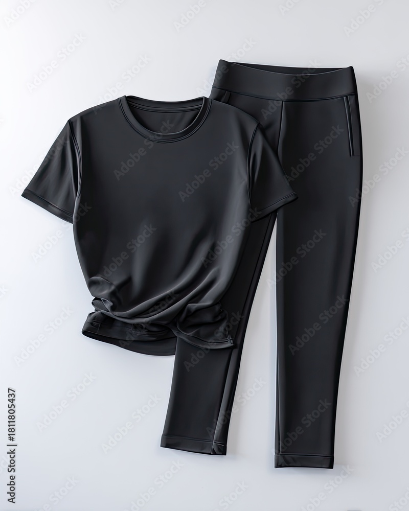 Sport - Dark gray/black, two-piece athletic outfit. Short sleeve top, fitted pants. Flat lay #1811805437
