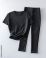 • Dark gray/black, two-piece athletic outfit. Short sleeve top, fitted pants. Flat lay