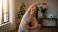 • Woman in gray athletic wear doing a side stretch in a bright living room with plants and a window
