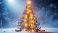 • Christmas tree made from hockey sticks and skates, illuminated with lights outdoors in snowy weather. Winter holiday sports concept.