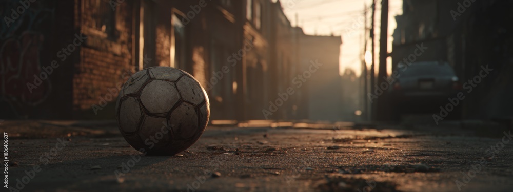 Sport - Urban Street Scene at Dusk with Soccer Ball on Dirt Pavement and Cinematic Lighting Effects #1886486637