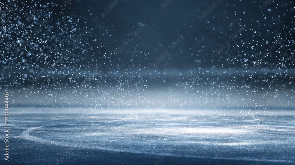 • Snow ice winter frost cold freeze water surface create sparkling spray above smooth rink blue bokeh background with copy space for skating hockey weather climate theme