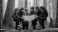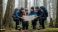 • Happy friends hiking in misty forest looking at map. Hikers with backpacks navigating woods. Outdoor adventure travel concept. Active lifestyle trekking journey nature. Teamwork route.