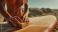 • Woman hands applying wax to surfboard on the beach for better grip. Summer sport preparation ritual. Ocean water activity.