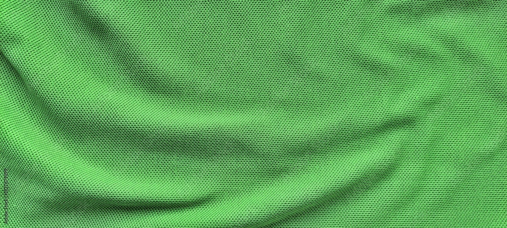 • Green sports jersey fabric texture close up. Soft football clothing textile background. Sports wear background with smooth green fabric detail.