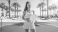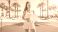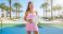 Smiling woman in a pink tennis outfit holding a white pickleball paddle on a tropical resort court od 0,00 zł Dopasuj i kup